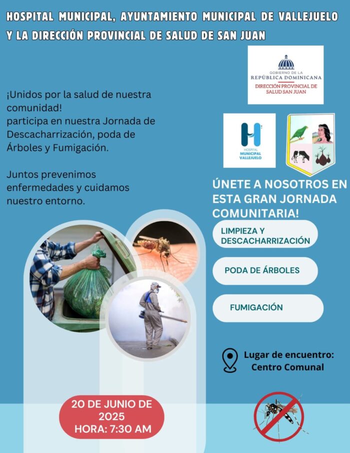 En un esfuerzo conjunto por promover la salud y el bienestar de la población, el Hospital Municipal de Vallejuelo, el Ayuntamiento Municipal y la Dirección Provincial de Salud (DPS) San Juan llevarán a cabo una gran Jornada Comunitaria de Descacharrización, Poda de Árboles y Fumigación este jueves 20 de junio de 2025, a partir de las 7:30 a. m., teniendo como punto de encuentro el Centro Comunal del municipio.