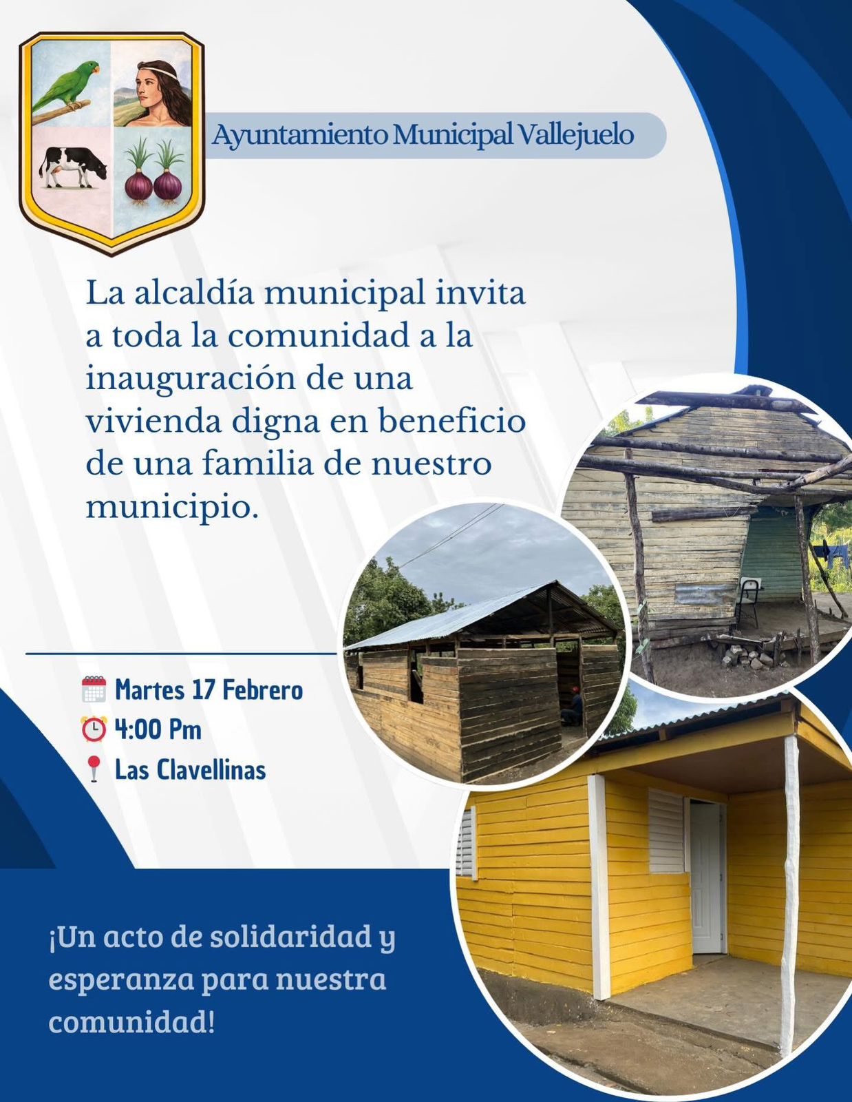 El alcalde Eddy Morillo, junto al Ayuntamiento Municipal de Vallejuelo, invita cordialmente a toda la comunidad a la inauguración de la vivienda del comunitario Manuel, una obra realizada con amor, solidaridad y un firme compromiso social.